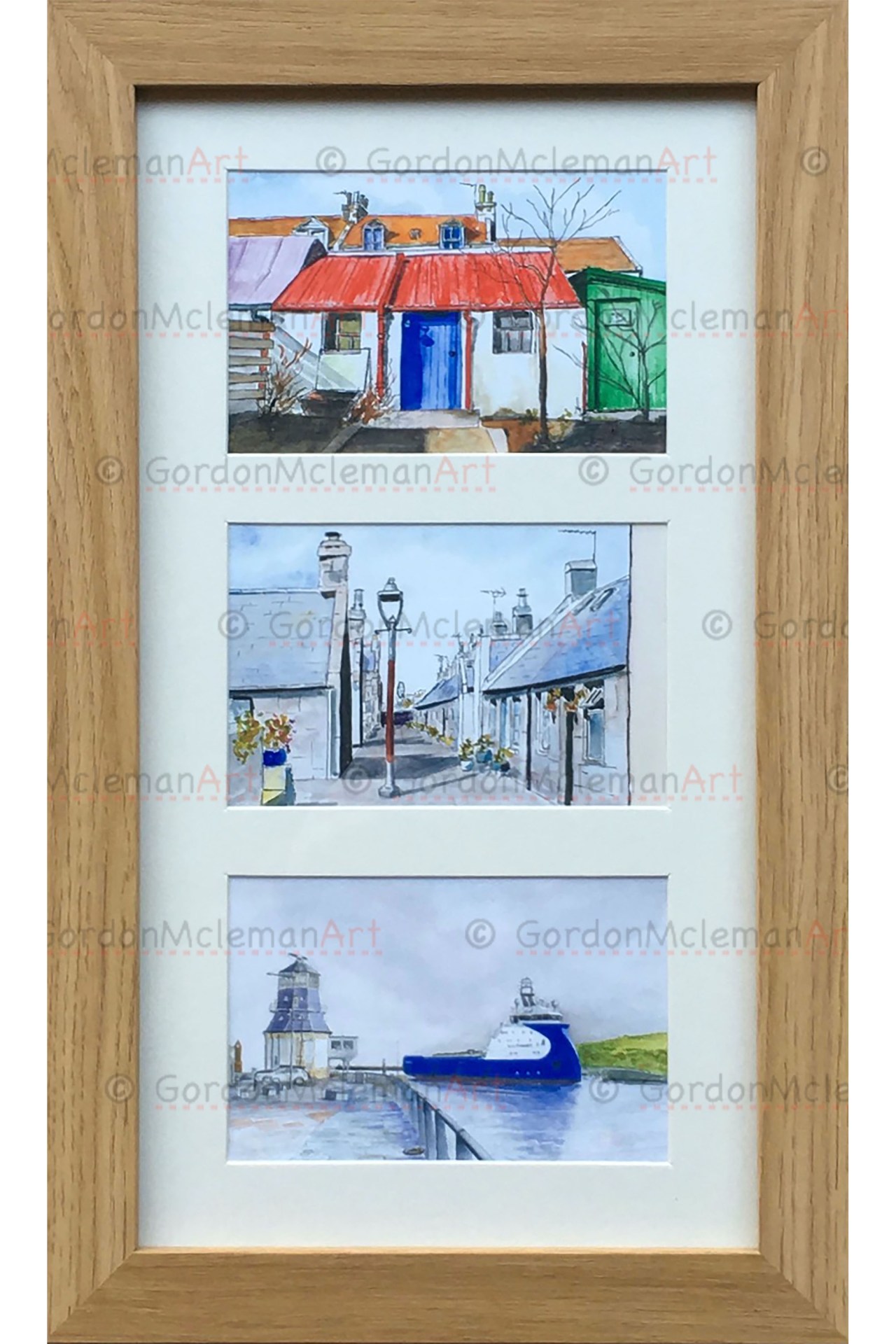 This is my framed collection of three colourful 6×4 inch prints of scenes in and around the ancient fishing village of Footdee (pronounced “Fittie”), Aberdeen, from my original pen and watercolour sketches. I’ve set the three prints in a nice natural wood effect frame, external dimensions approx 26 x 10 inches.