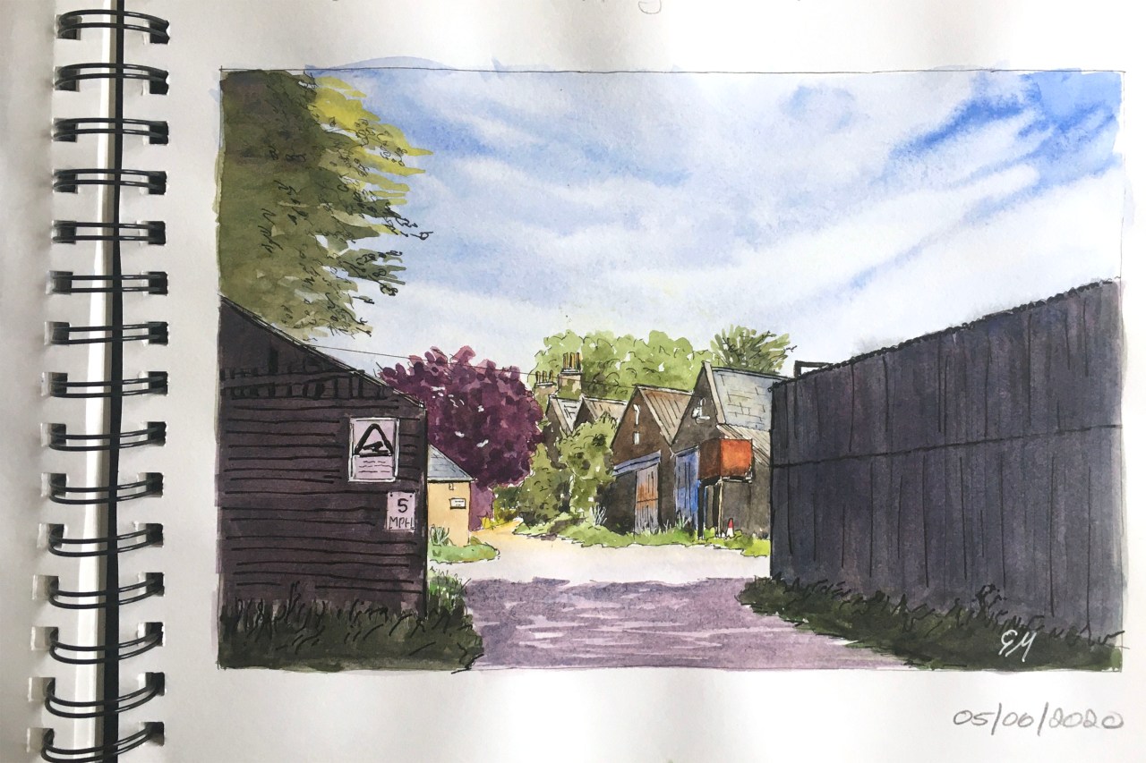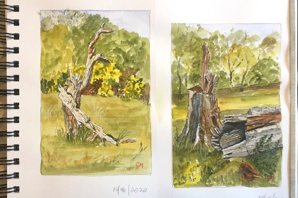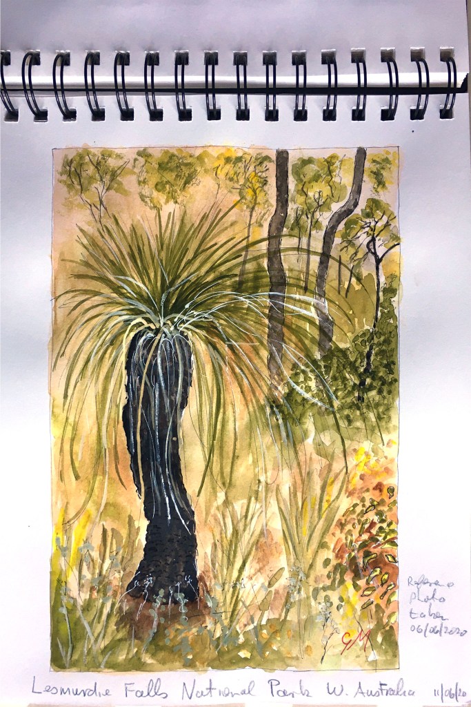 More from my sketchbook, scenes I pass when out walking with my dog, except for Lesmurdie Falls National Park, an area in W. Australia affected by bush-fires earlier this year but now recovering, based on a photo taken by my son a couple of weeks ago.