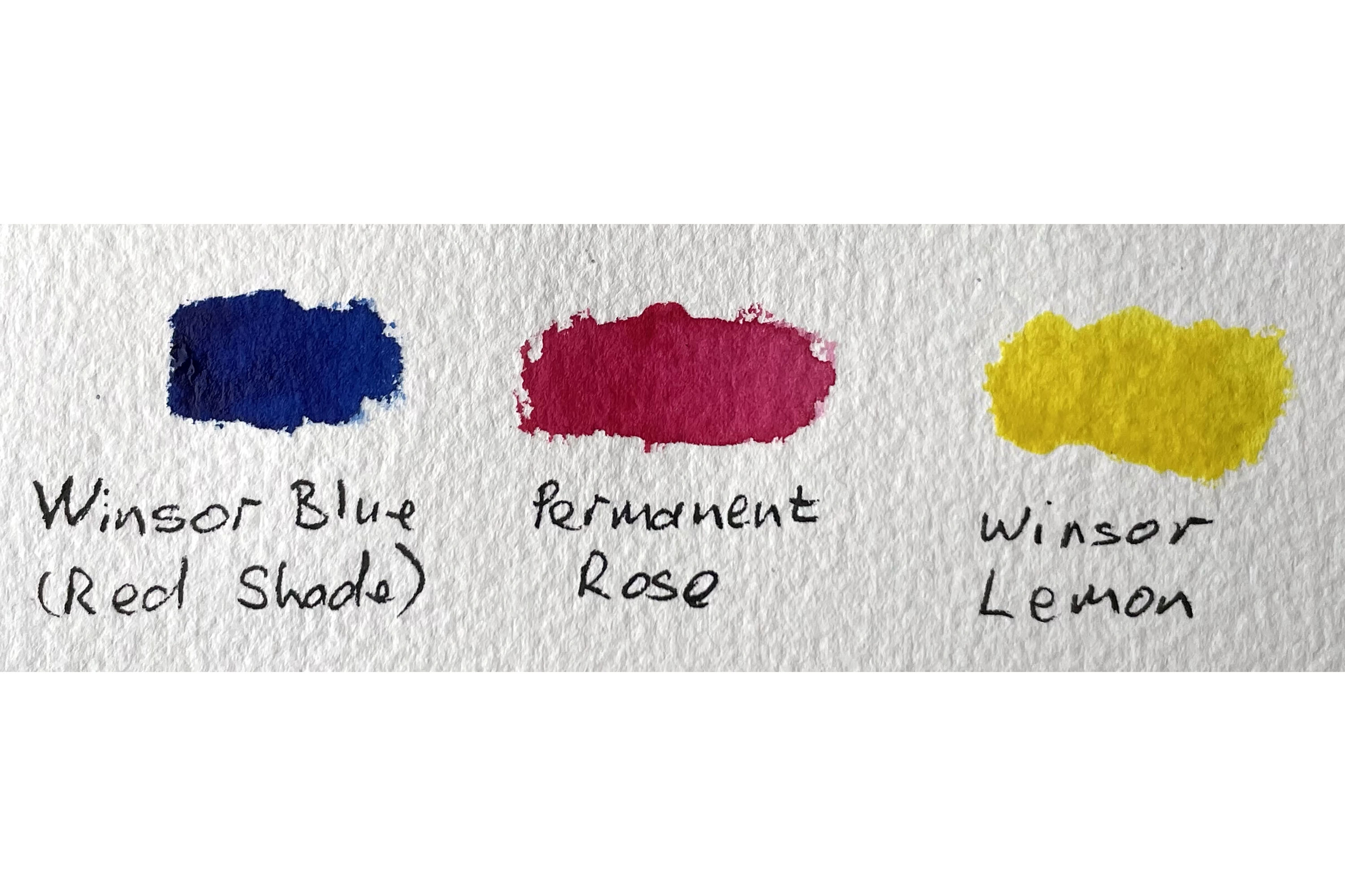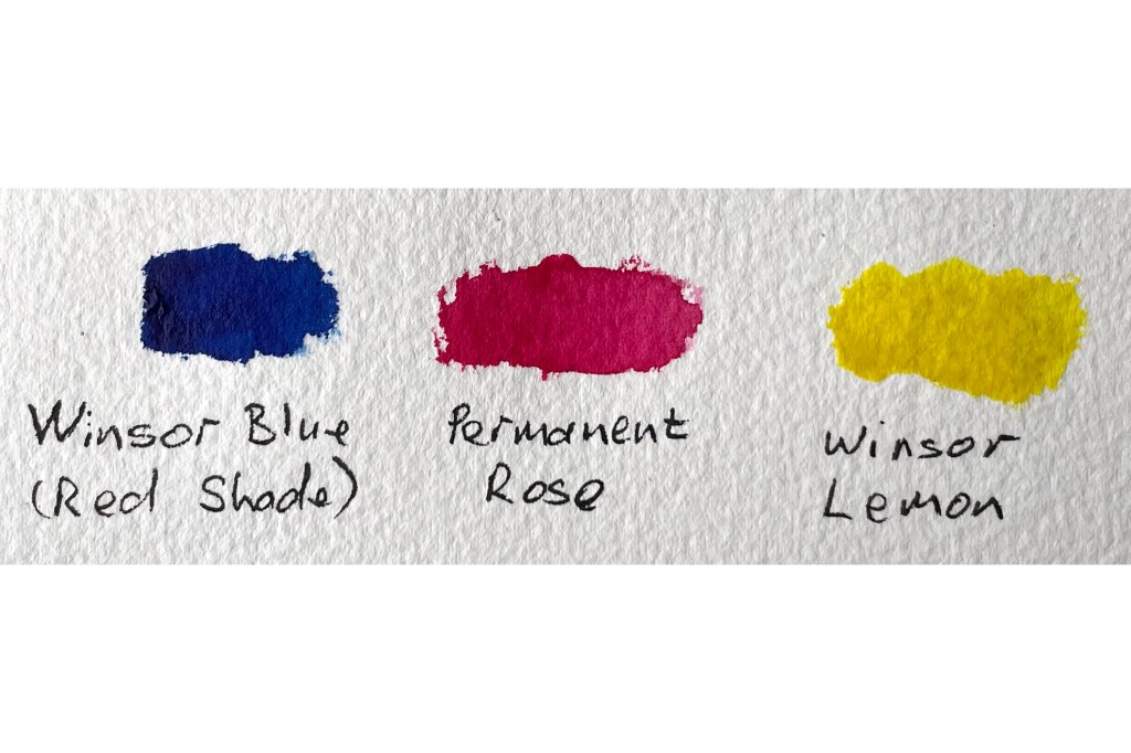 It was done using only the three primary colours shown (all from Winsor & Newton): Winsor Blue (red shade), Permanent Rose & Winsor Lemon. I managed to get all the colours and tones I needed from mixing just these three,