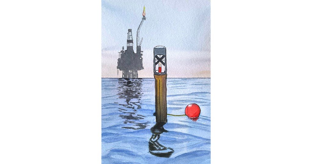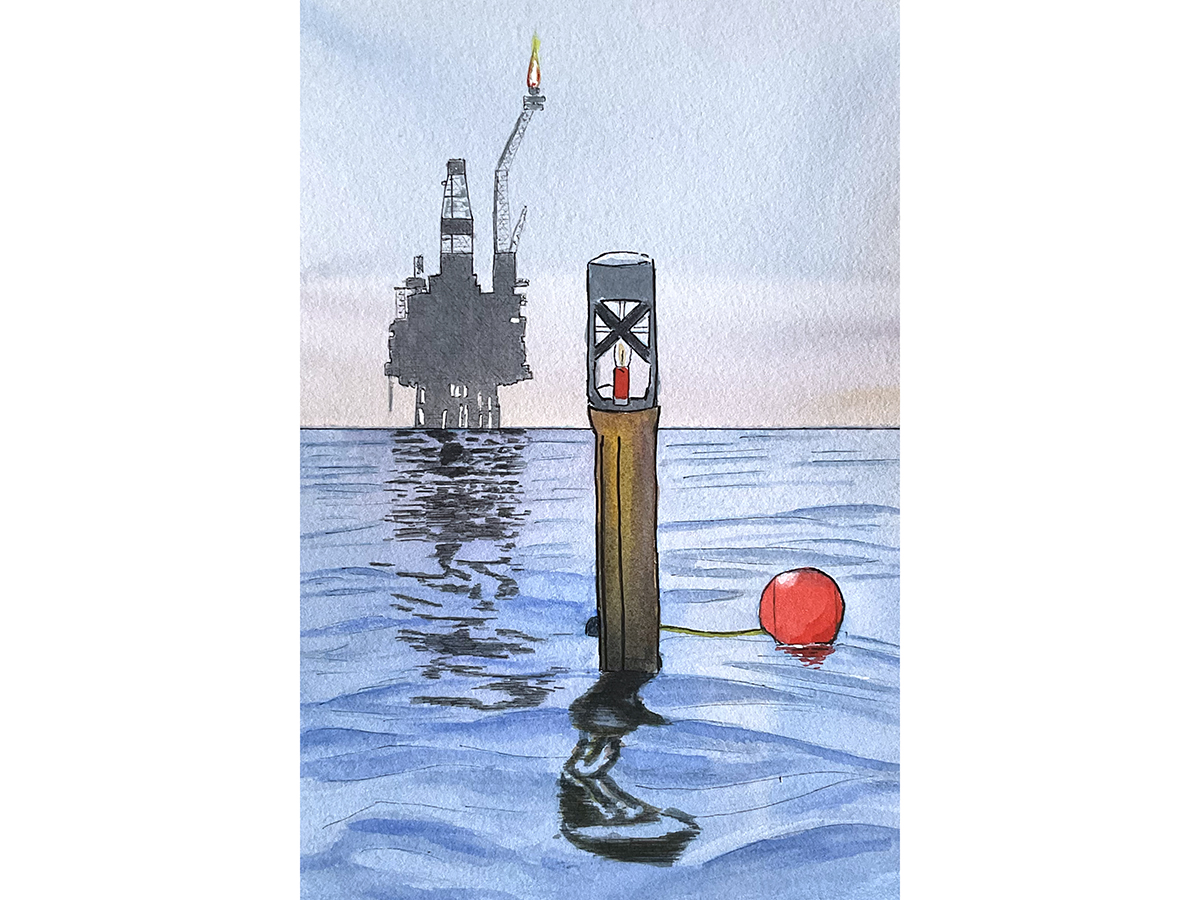 My sketch for today shows the buoy which marks the spot where Alpha lies beneath the waves, with its sister platform Bravo in the background, still producing today.
