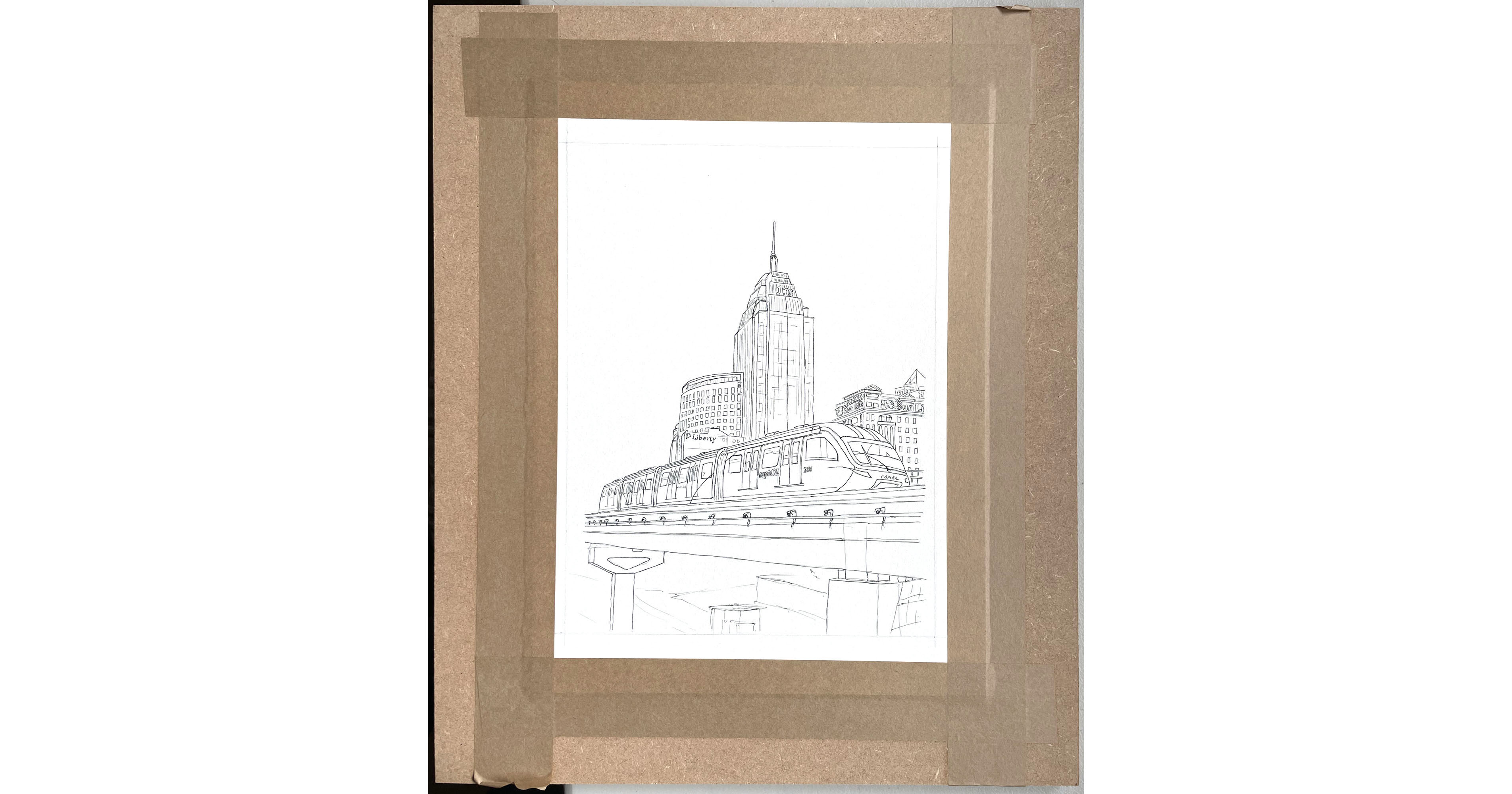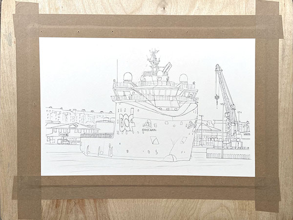 Some are just at the reference photo stage, others have made it as drawings onto watercolour paper, like the platform supply vessel ‘Skandi Aukra’ and the Kuala Lumpur scene shown above.