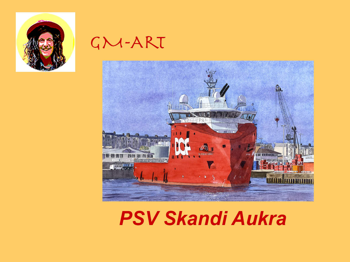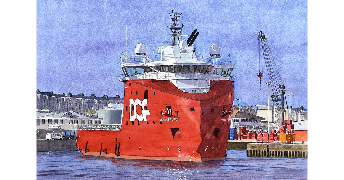 This is my interpretation of the PSV Skandi Aukra manoeuvring around Aberdeen Harbour, in pen & watercolour, based on a reference photo I took myself.