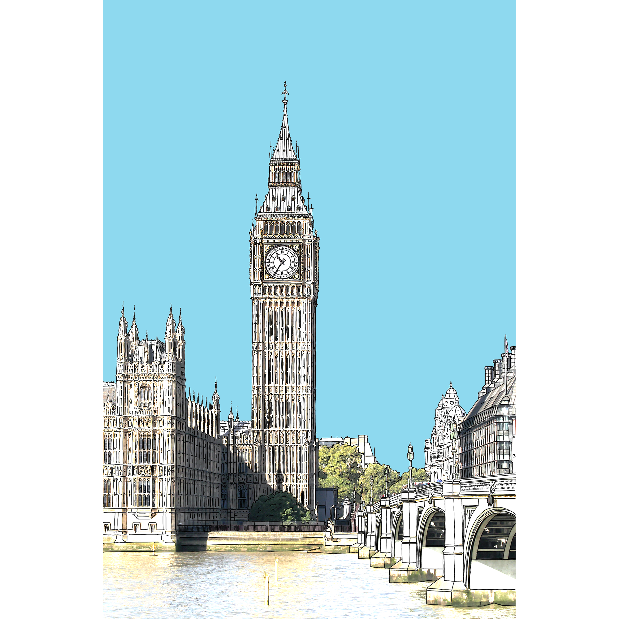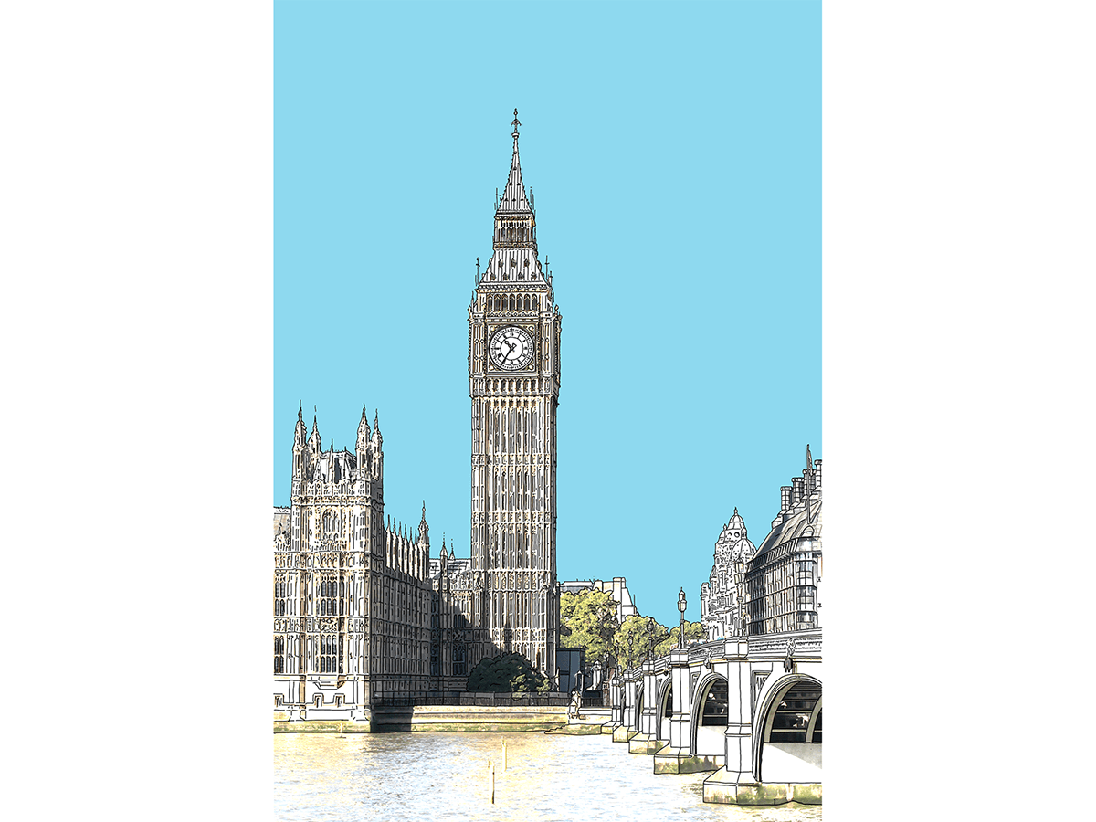 In this print of my work you can see the Elizabeth Tower in the centre, with Westminster Bridge to the right and the Parliament Buildings on the left.