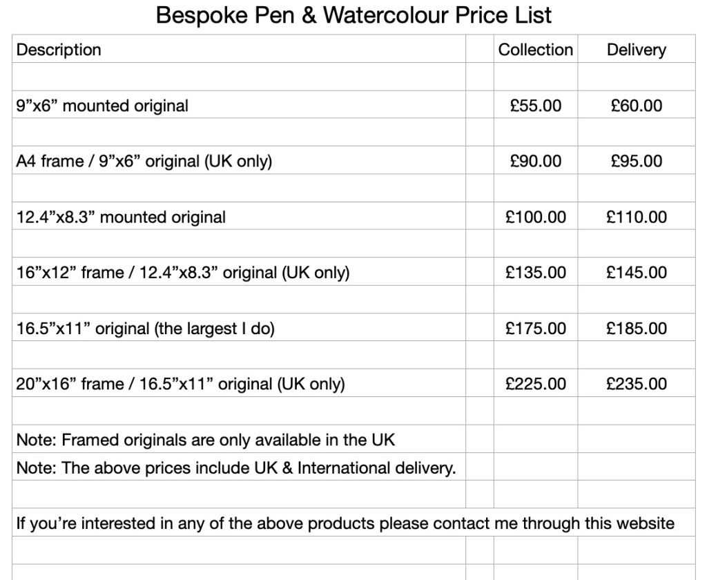 My Price list for Pen & Watercolour Commissions Date: September 17, 2023Author: GM-Art Category: Commissions, House Portraits, Industrial Portraits, Pen & Watercolour Tags: Commissions, Pen and Watercolour Post navigation ← Just for Fun! My Price List for Prints → Share this: Click to share on LinkedIn (Opens in new window) LinkedIn Click to share on X (Opens in new window) X Click to share on Pinterest (Opens in new window) Pinterest Click to share on Facebook (Opens in new window) Facebook Click to print (Opens in new window) Print Like Loading...