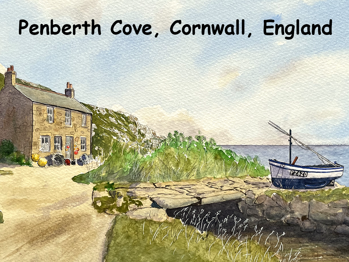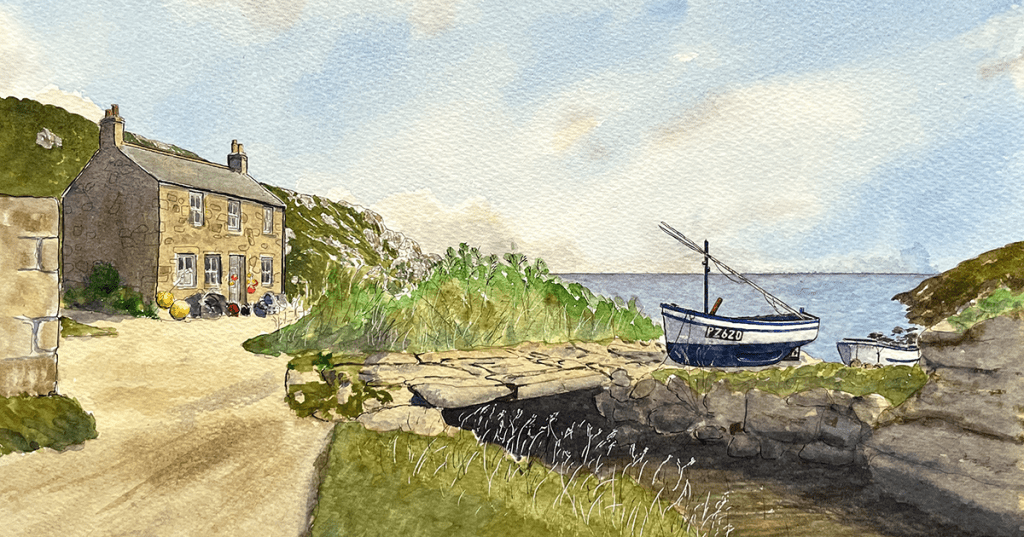 I lived in Cornwall for a few years back in the 90’s and I still look to Cornish scenes for inspiration. This is my interpretation of a scene from the village in pen and watercolour.