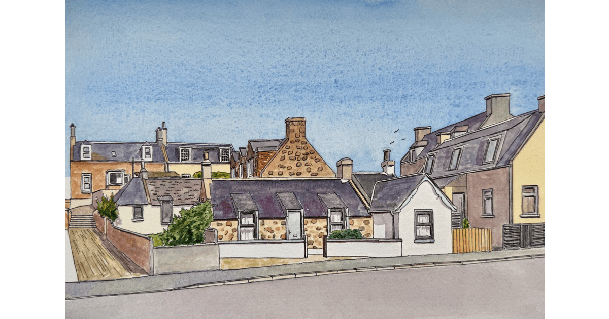 This is a nice scene of some of the Roanheads houses in Pen & Watercolour, based on my own photograph. The painted area is approx 11.5” x 7.0” on good quality hot pressed watercolour paper.